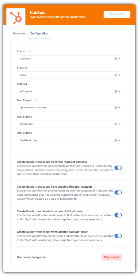 When connecting HubSpot and Buildertrend, it’s crucial to know how the two systems talk to each other. The integration relies on a contact’s lead status or deal stage to trigger movement between platforms.